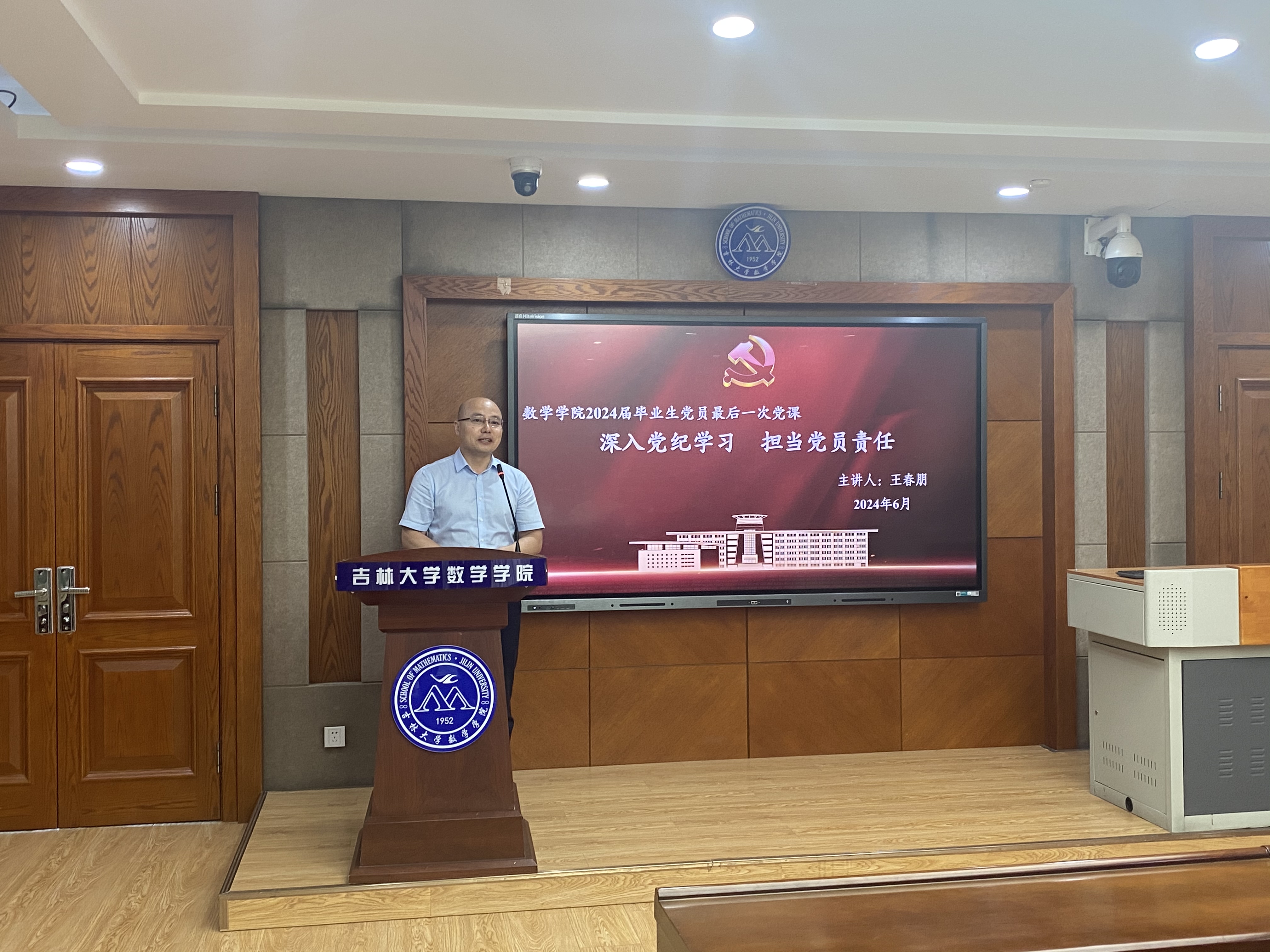 为推动党纪学习教育走深走实,教育引导全体毕业生党员增强纪律意识,在知敬畏、存戒惧、守底线中夯实理念信念之基,在推进强国建设、民族复兴伟业中展现青春作为、彰显青春风采、贡献青春力量。6月17日,数学学院党委书记王春朋为2024届全体毕业生党员讲授了毕业前“最后一次党课”。