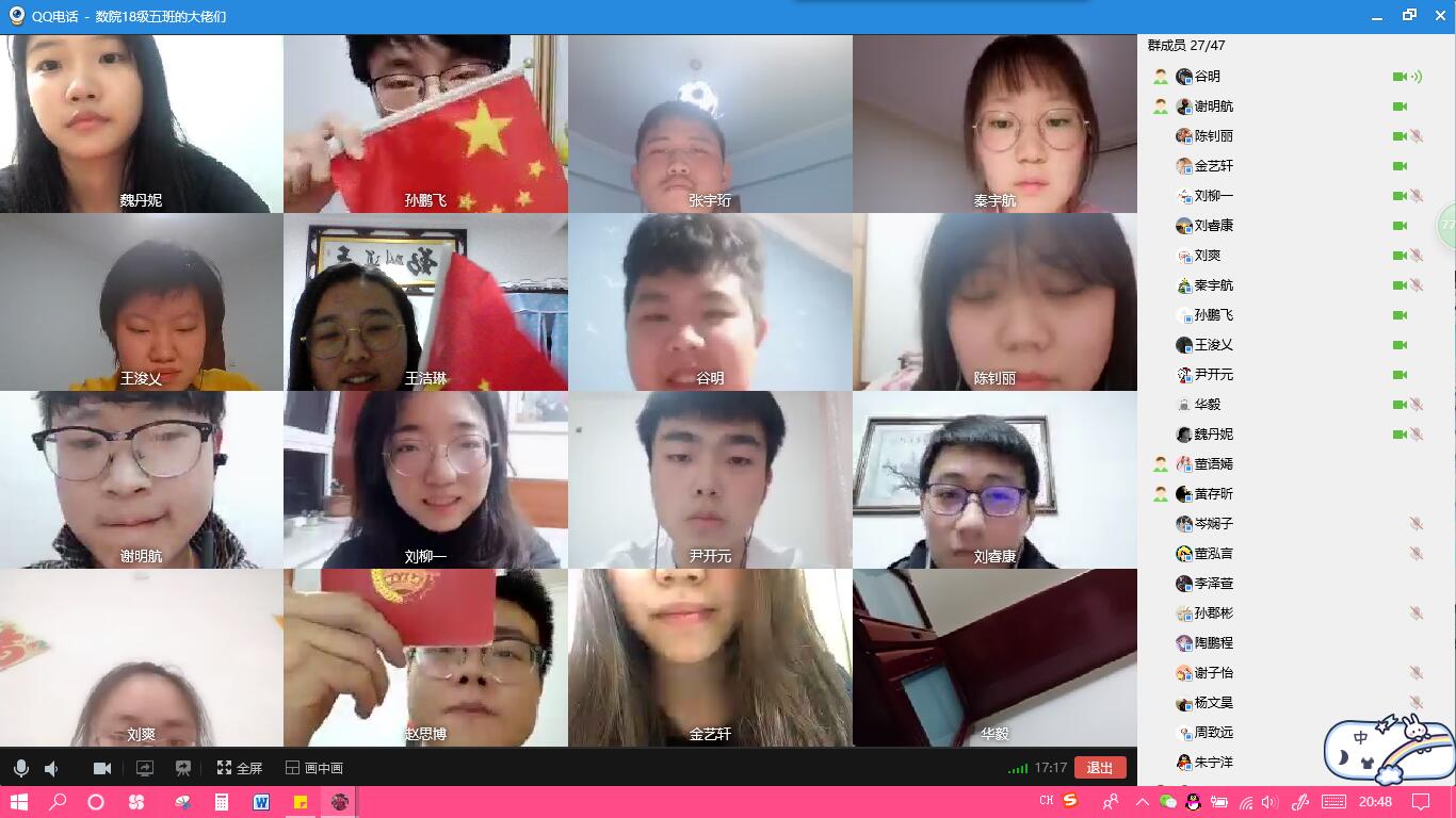 2020529日,数学学院20185班采用视频会议的方式召开“雨涤新夏战疫先,数院齐心御时艰”线上主题班会。