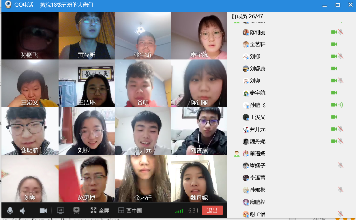 在这次班会中,同学们十分激动与欣喜,畅快地分享自己的网课学习生活,交流着生活中的所见所闻。本次班会使同学们倍受鼓舞,他们纷纷表示在支持国家的防疫工作的同时,努力学习专业知识,在未来为数学学院增光添彩,为祖国建设添砖加瓦,在人民需要的时候挺身而出,无惧风雨,勇挑重担,慎思笃学,用奉献与责任绘就新时代青年的青春担当!