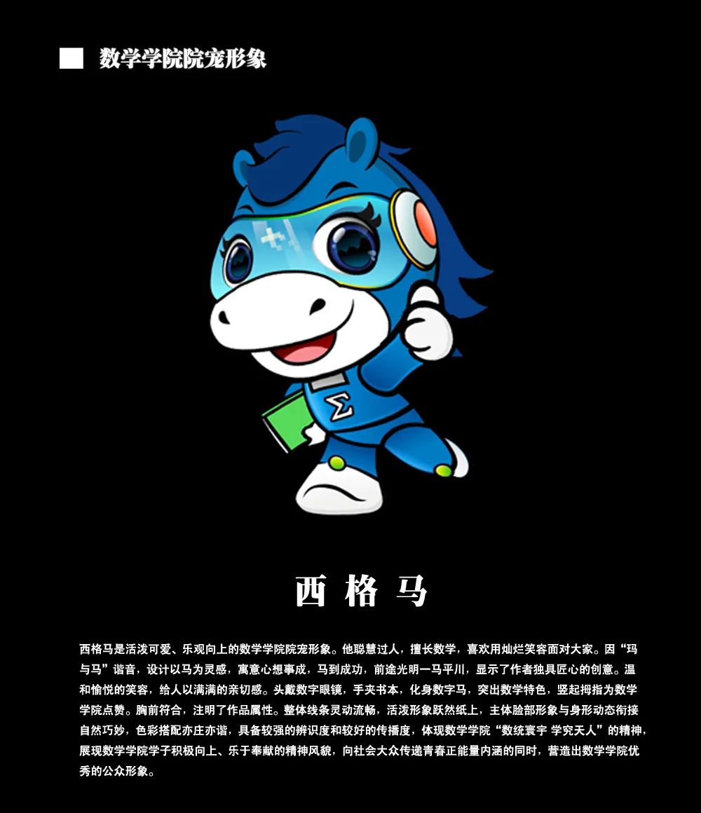 2020年10月4日beat365中国官方网站面向数学学院全体师生举行了“C格马sigma院宠由你定”活动,征集时间:2020年10月14日——10月24日。作品要求包括:一、院宠体现数学学院“数统寰宇 学究天人”的精神,展现数学学院学子积极向上、乐于奉献的精神风貌。以上述院宠名字“C格马Sigma”及其寓意为设计理念,可融合多种元素。二、院宠形象设计图应为富有亲和力,充满朝气的健康活泼的卡通形象,内涵丰富,符合大众审美,新颖,独特,美观,大方,便于识别和记忆,寓意贴切。三、作品要求原创,不得抄袭,一经发现,取消参赛资格;若因非设计原创所造成的任何纠纷、一切法律责任及造成的损失由设计人承担。作品可手绘,也可利用电脑软件进行设计,要求作品清晰。