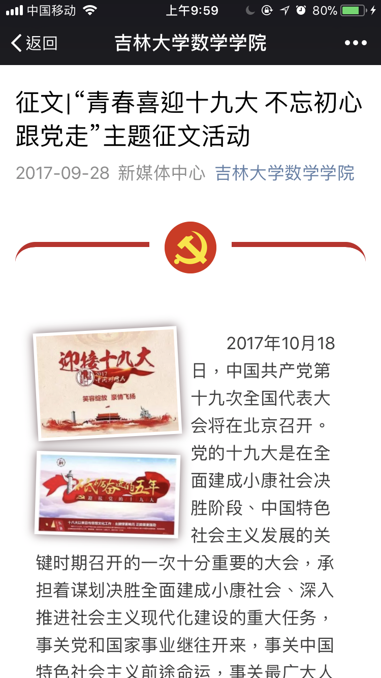 为迎接十九大的召开,数学学院团委社会实践部于九月二十九日至十月九日举办了“青春喜迎十九大 不忘初心跟党走”主题征文活动。
