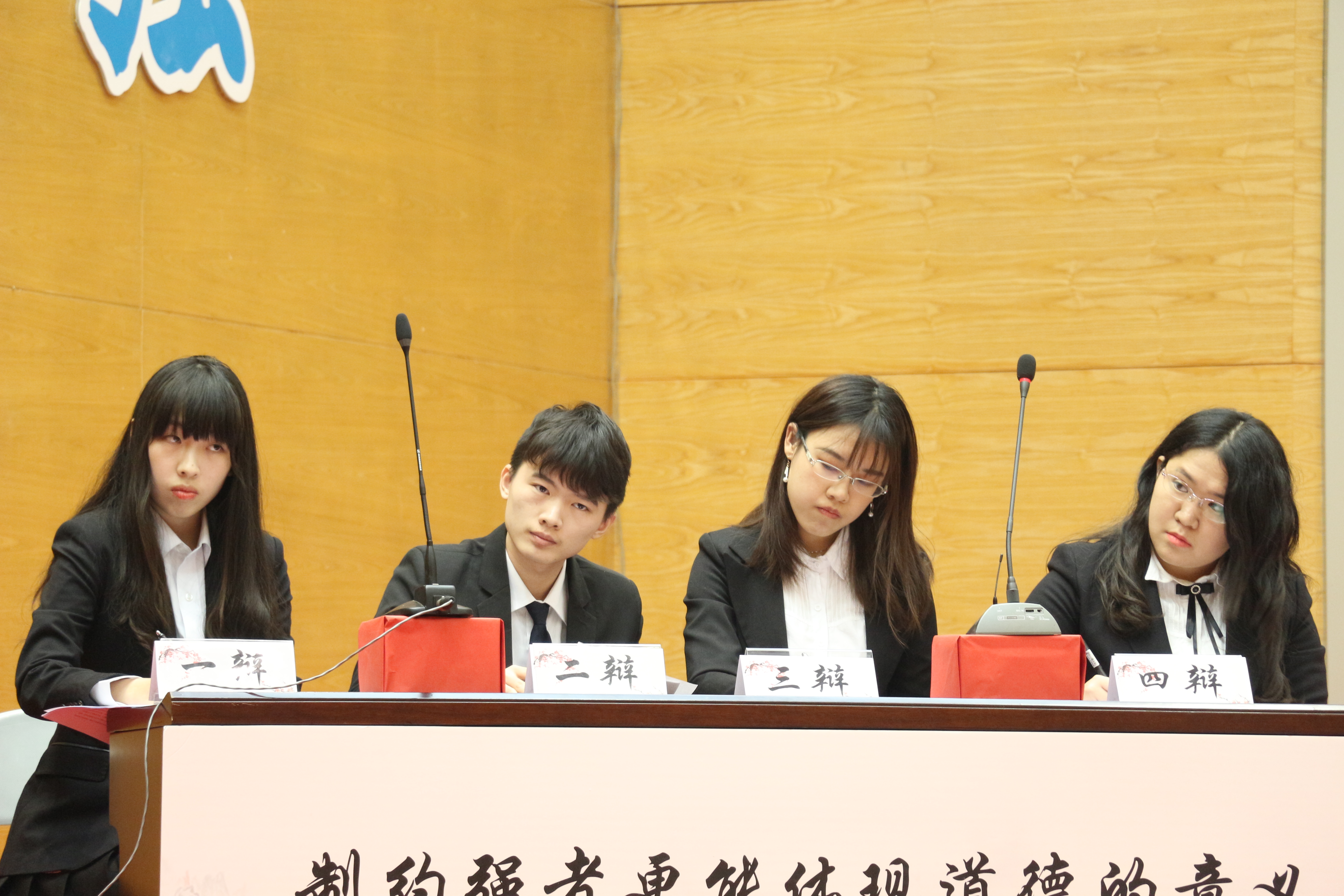 是谁,舌灿莲花,堪使丝竹失色;是谁,唇如利剑,可令管弦无声。在欢呼和呐喊声中决赛拉开序幕,决赛辩题为帮助弱者与制约强者哪一个更能体现道德的意义,数学学院为反方制约强者更能体现道德的意义。我方一辩辛悦开篇立论提出道德的意义在于促进社会和谐发展,并从维护社会秩序,解决社会矛盾,引导正向价值三个方面掷地有声地陈述。我方二辩俞宁宁紧随其后,幽默生动地重申保护和制约的概念,拆解对方观点。应对质询,从容不迫,灵活地化解了对方的进攻。我方三辩程蕾巧妙发问,从动机过程结果三个角度准确地论述了制约强者所能体现出的道德意义。我方四辩刚铭君字字珠玑,鞭辟入里,动之以理晓之以情,一句“不要人夸颜色好,只留清气满乾坤”声震全场,引得掌声雷动。评委老师从学理的角度阐释了对辩题的理解并对场上辩手提出了表扬。在万众期待中,主席宣布结果,数学学院荣获冠军!共青团吉林省副书记牟大鹏为数学学院颁发了奖状以及奖杯。