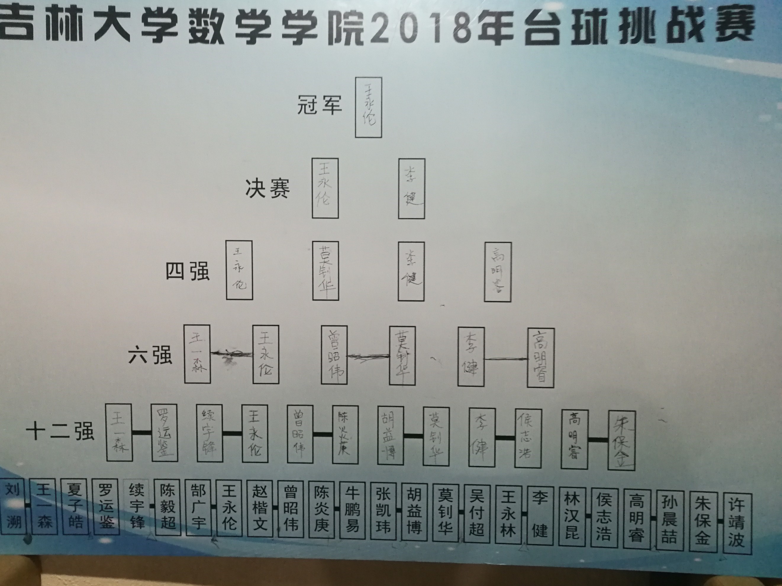 七局四胜制的巅峰之战让台球赛迎来了最终的高潮。强强对话,双方都显得有些紧张,一球的失误可能就会让对手一杆收掉一局的比赛。前四局,双方战成3:1,王永伦率先拿到赛点,在第五局中,最终打进黑球的王永伦眼睁睁看着白球滚入底袋,遗憾失去一局。在第六局中,王永伦没给对手留下机会,干净利落的收掉比赛,以四比二的比分淘汰誓在卫冕的前冠军,捧起了2018数学学院台球挑战赛的冠军。