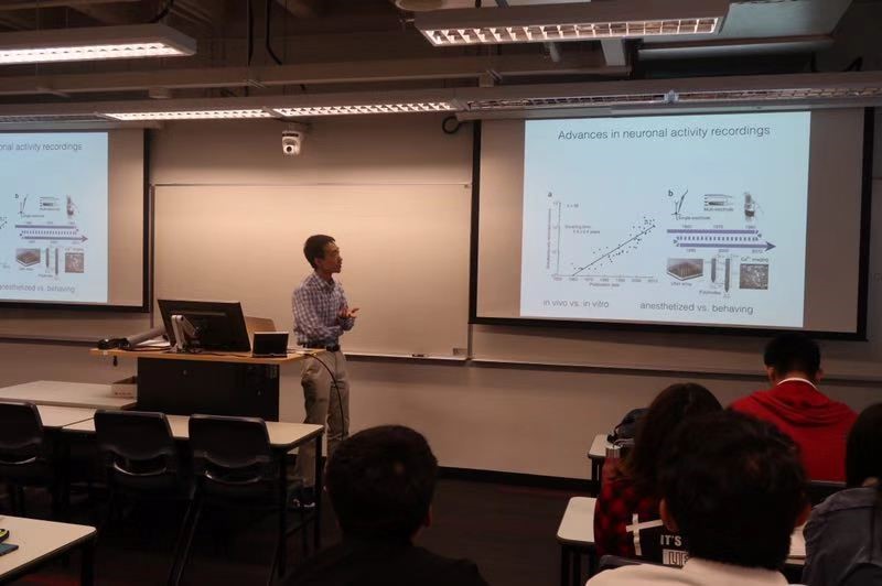 随后,Professor Yu Hu带来了讲座“Relating connectivity statistics of neural circuits to thecollective dynamics of neurons.”数据的统计与研究无疑是当下众多研究中不可忽略的内容,无论是从庞大的数据中探寻规律或是利用数据佐证论断,数据分析的能力都是我们必须具备的。面对快速发展的科学研究以及世界人民对于研究进步的急切需求,如何快速准确的处理这些问题,正是我们所需要攻克的难题,通过老师的讲解,我们学习到了其中一些思想和初步的计算,而相信在日后的学习中,我们会不断进步,取得更进一步的成果。