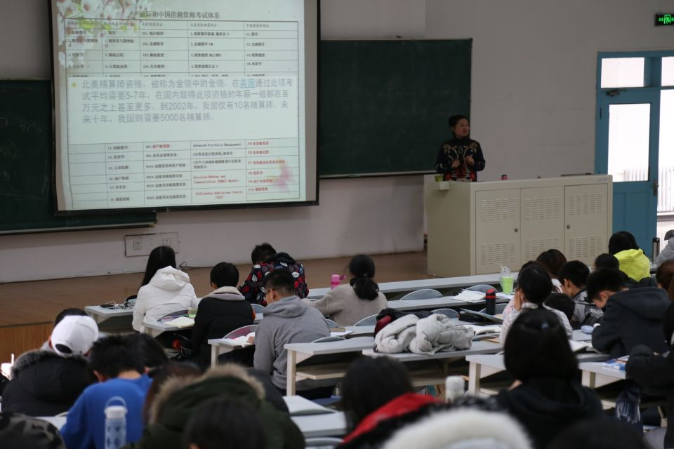 随后,韩老师  着重介绍了关于保险精算的学科以及关于精算师资格的考试。目前主要的精算考试分为北美寿险,北美非寿险与中国精算师考试。其中北美精算师的考试SOA要求完成五门初级考试(Exam P, FM, MFE, MLC, C),三门由北美精算师协会认可的大学课程(VEE),一门网上教学课程(FAP)并参加一个为期半天的研讨会(APC),才能获得准会员资格,也即我们说的准精算师的资格。而目前北美精算师协会认可的VEE课程的高校就包括了吉林大学。而中国精算师考试分为两部分,首先需要考取准精算师,准精算师部分由把门考试科目组成,每门考试均为3小时笔试。当取得准精算师资格证后,才可继续进行精算师的考试,精算师部分分为寿险与非寿险两方向,每门考试均为4小时,考生可根据自己的情况自主选择参加寿险或非寿险。