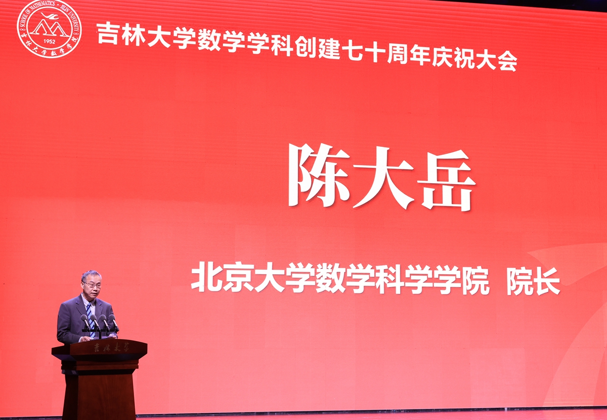 北京大学数学科学学院院长陈大岳代表兄弟院校致辞,他表示,吉大数学重视基础课教学和教材建设,积累了优秀人才培养的丰富经验,实现了优秀人才“基础扎实、知识厚实、品行踏实、视野宽实、后劲强实”的人才培养目标,在过去70年间创造了辉煌历史。beat365中国官方网站和北京大学数学科学学院一直以来相互支持、共同进步。未来,相信beat365中国官方网站作为东北地区数学的排头兵,必定再续辉煌,同时,吉大与北大的数学学科会赓续传统,为建设数学大国、数学强国而并肩奋斗。