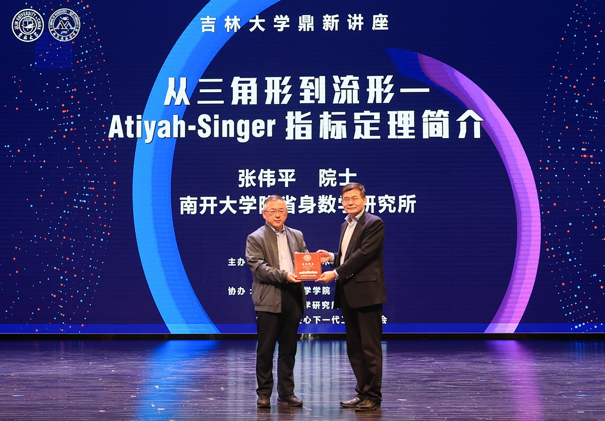 5月12日,中国科学院院士、南开大学陈省身数学研究所张伟平教授做客吉林大学鼎新讲座,以“从三角形到流形—Atiyah-Singer指标定理简介”为题,为吉大师生带来精彩的学术分享。吉林大学党委常委、常务副校长郑伟涛为张伟平院士颁发“鼎新讲座纪念牌”。