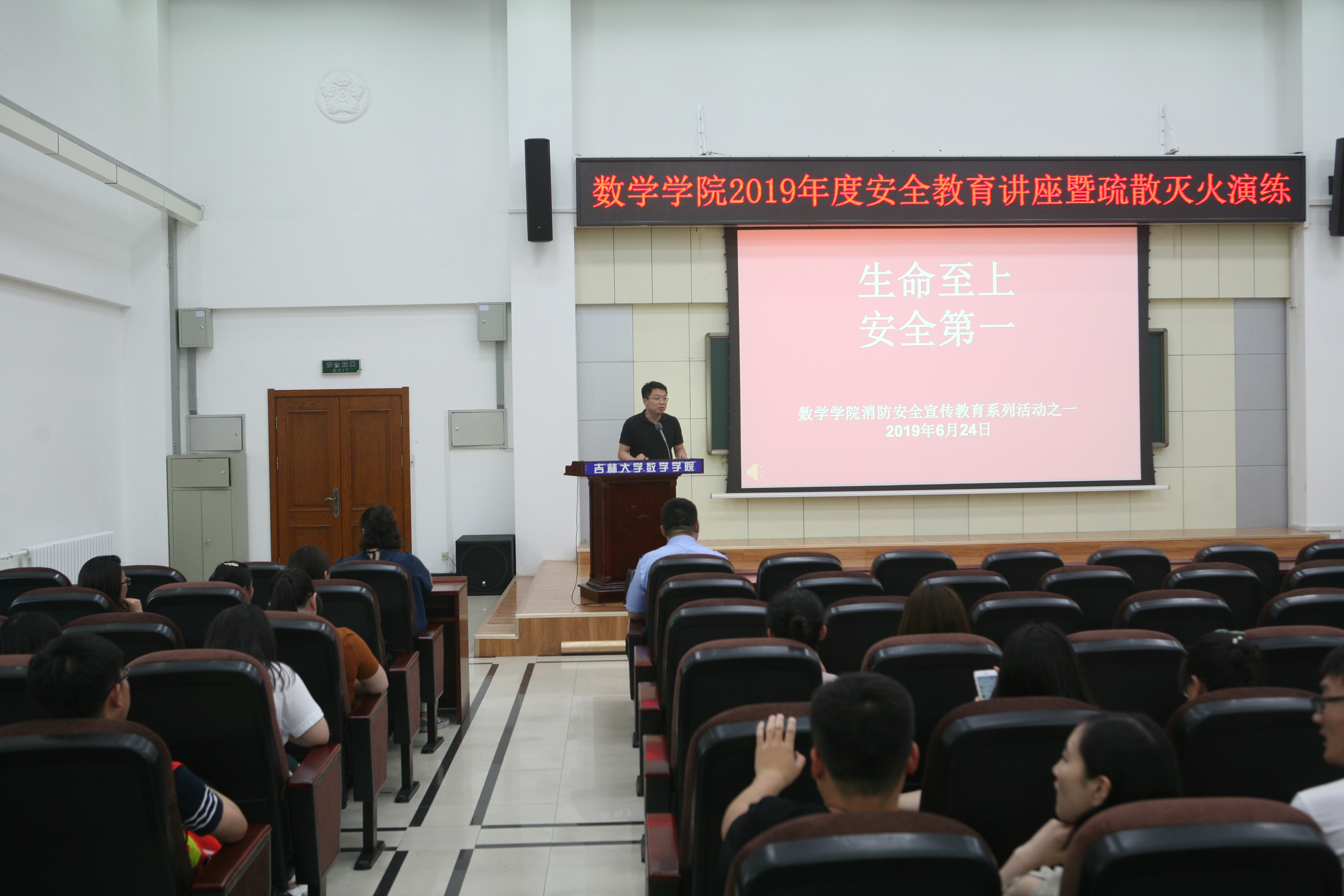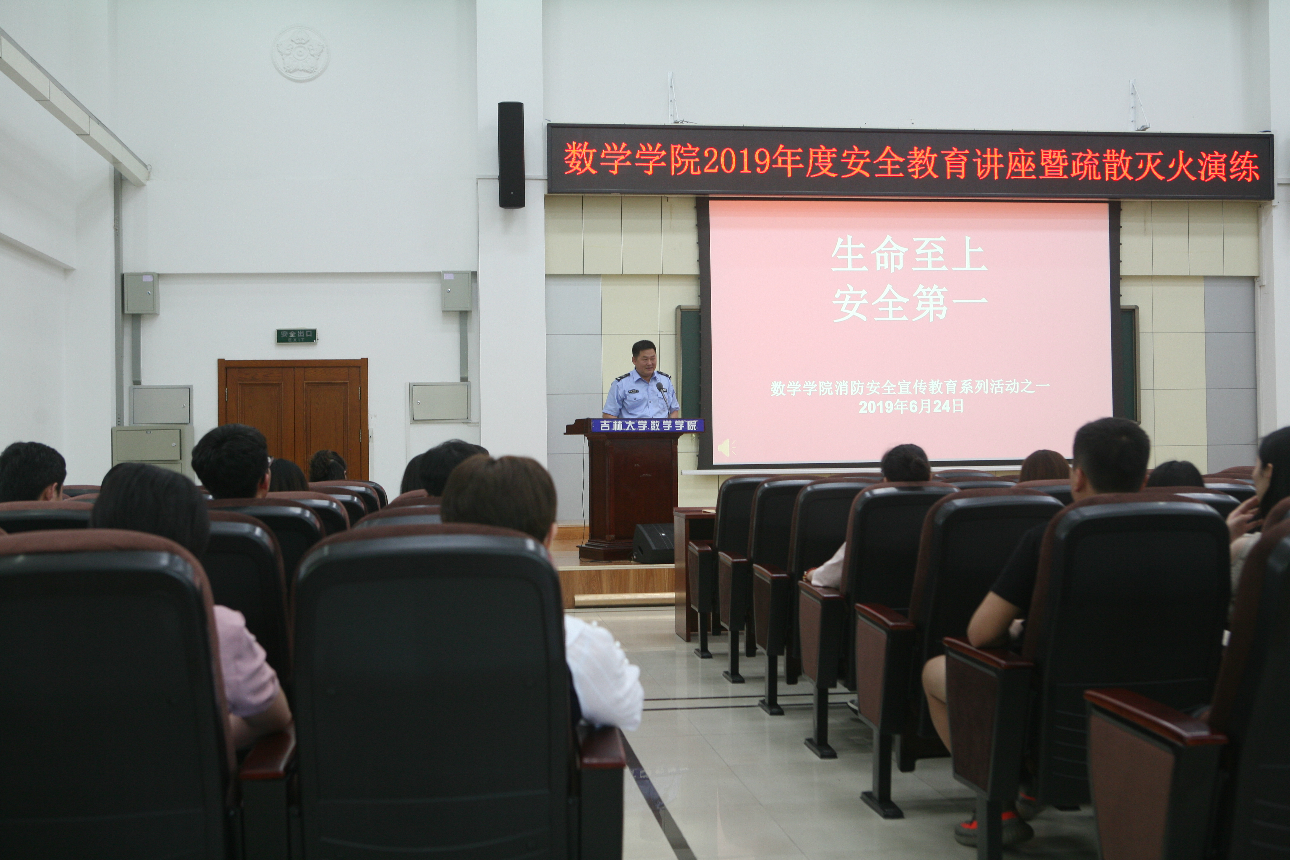 6月24日下午14:00,数学学院联合学校保卫处共同组织的“2019年消防安全知识培训暨消防应急疏散演练”活动在数学楼成功举行。数学学院部分党政领导班子成员、行政教辅工作人员和本科生、研究生代表百余人参加了本次消防演练活动。本次活动分为安全知识培训、应急疏散和火场救援演练、消防器材实物教学三个环节。活动由数学学院行政副院长陈续升主持。