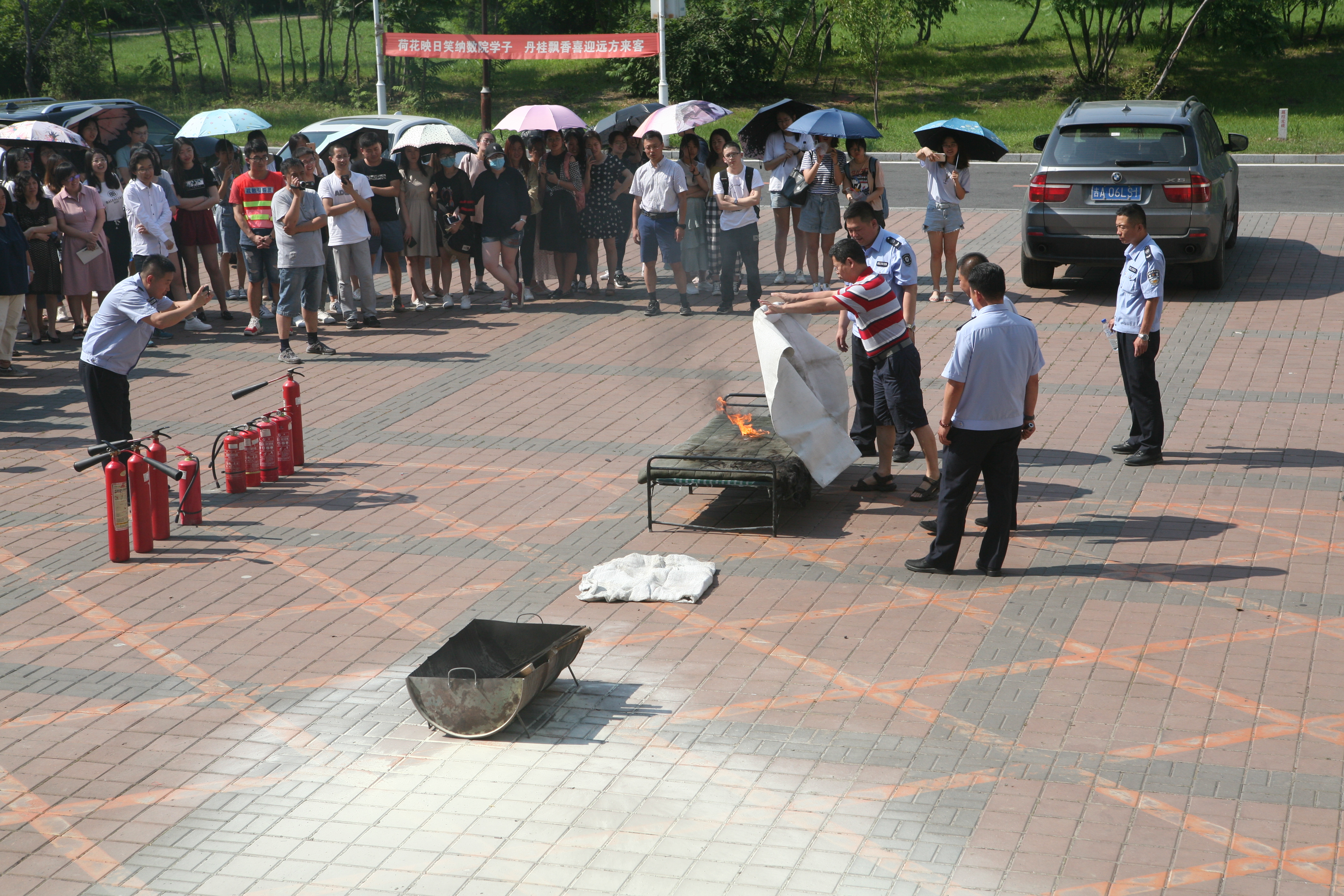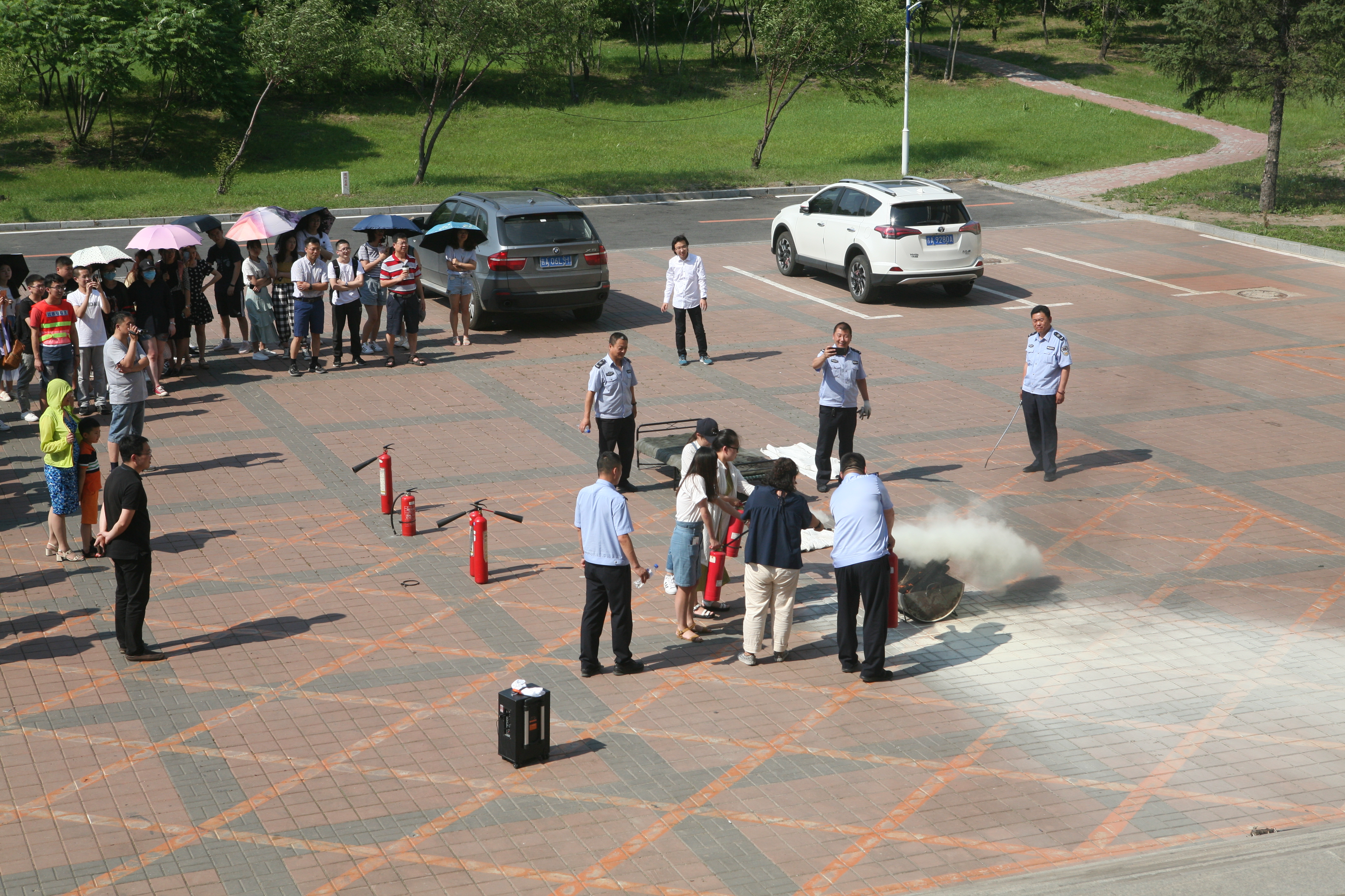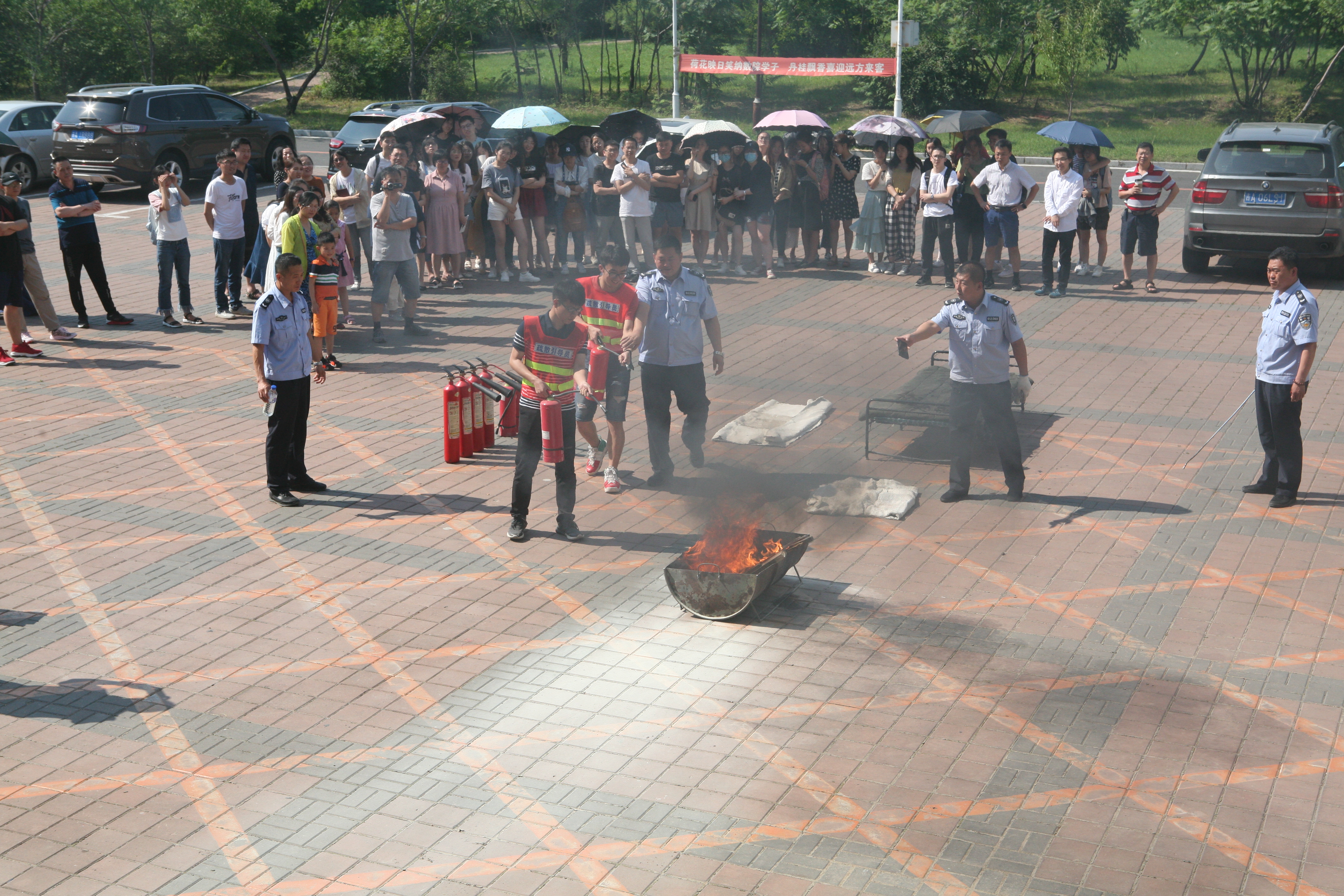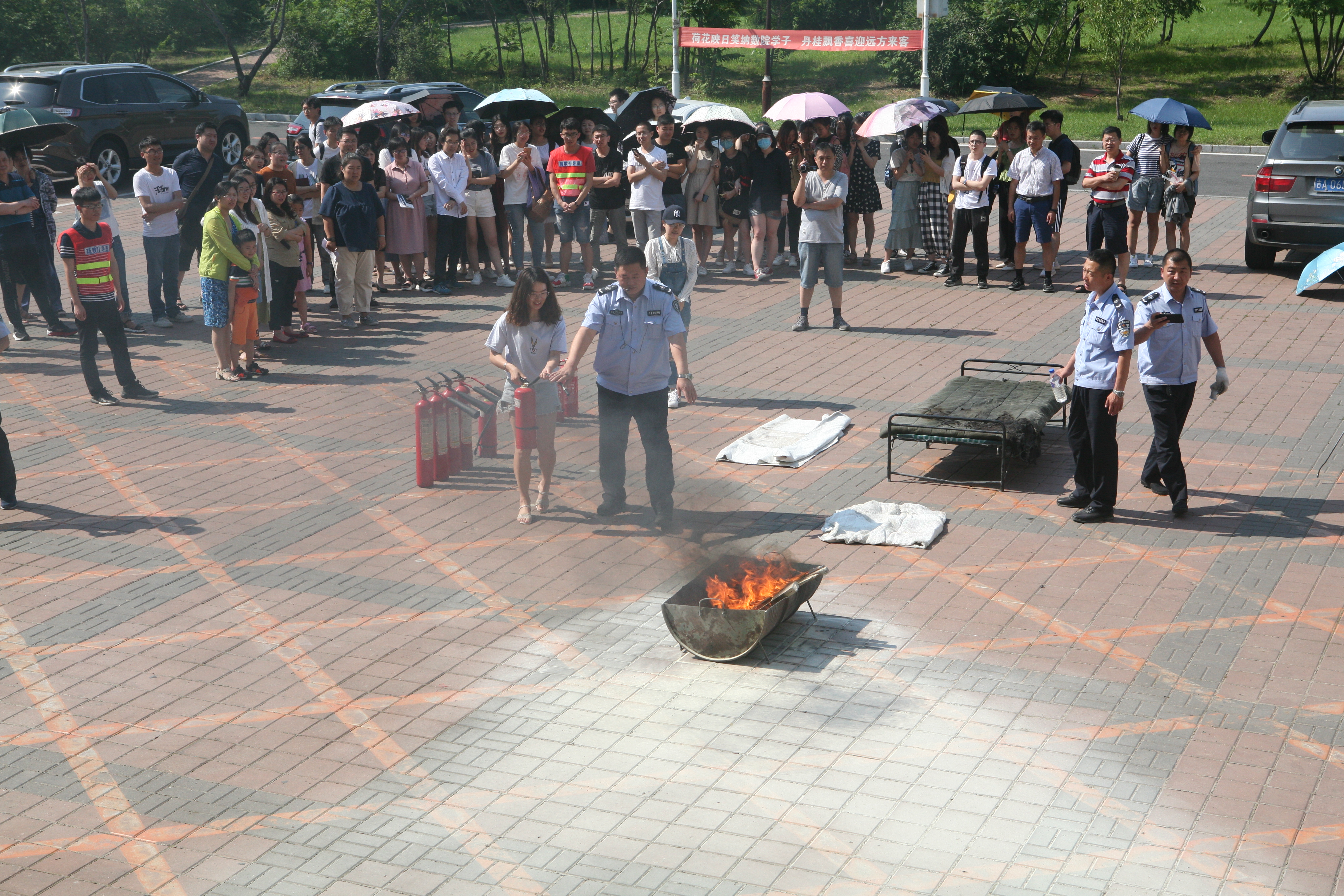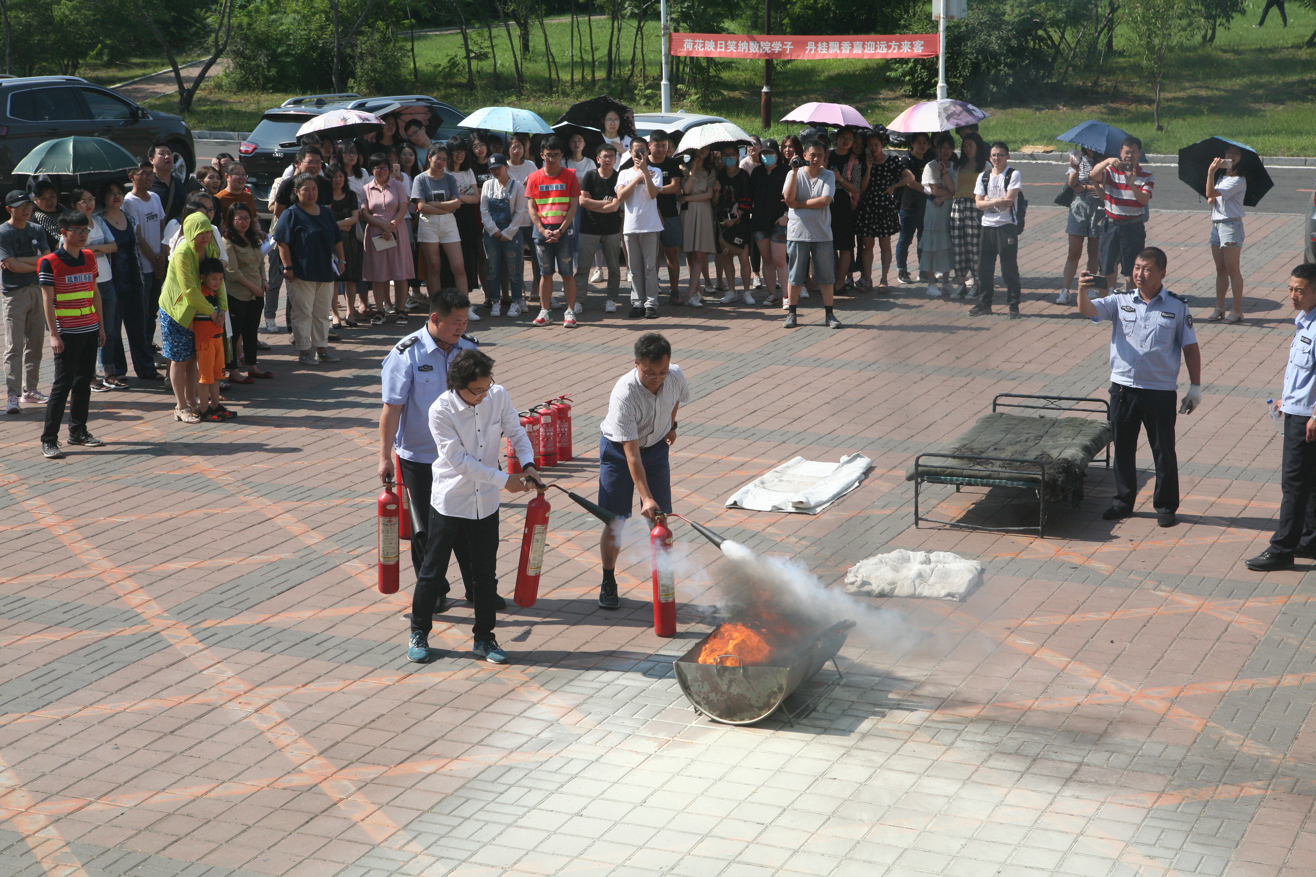 在消防器材实物教学环节,董立明老师详细讲解并演示了干粉灭火器、二氧化碳灭火器、防火毯等消防器材的使用方法。然后由部分师生亲自上场操作,提起灭火器,拉开保险栓,手握喷射软管,对准火源根部喷射,“熊熊大火”被成功扑灭。部分女生克服恐惧心理,提着灭火器,慢慢靠近火源,在保卫处工作人员的指导下也顺利完成了灭火任务。
