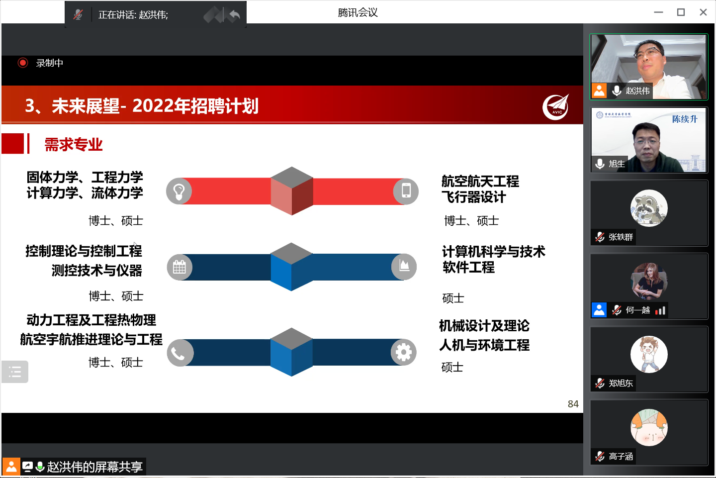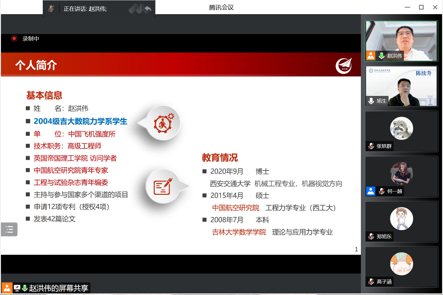 为做好研究生就业创业引导工作,帮助学生树立正确的就业观、择业观、成才观,数学学院研究生“学长说”系列活动第二期之“十四年回归 数学人讲强度事”于2022年5月14日18时成功举办。本次活动特邀嘉宾为中国飞机强度研究所的赵洪伟老师。数学学院党委副书记陈续升参加会议并致辞。