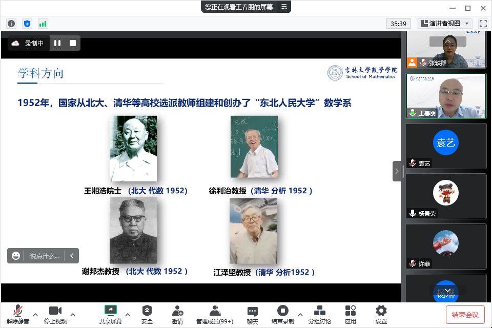 王春朋教授从数学学科建立开始,讲述了数学学科是如何在王湘浩院士等老一辈教育家们的一步一步开拓中茁壮发展的,讲述了数学学院70年来在科研和人才培养领域取得的瞩目成就,讲述了学院在新的建设时期为老师同学们提供的各类学术交流平台,并鼓励同学们积极学习,为学院发展建言献策。