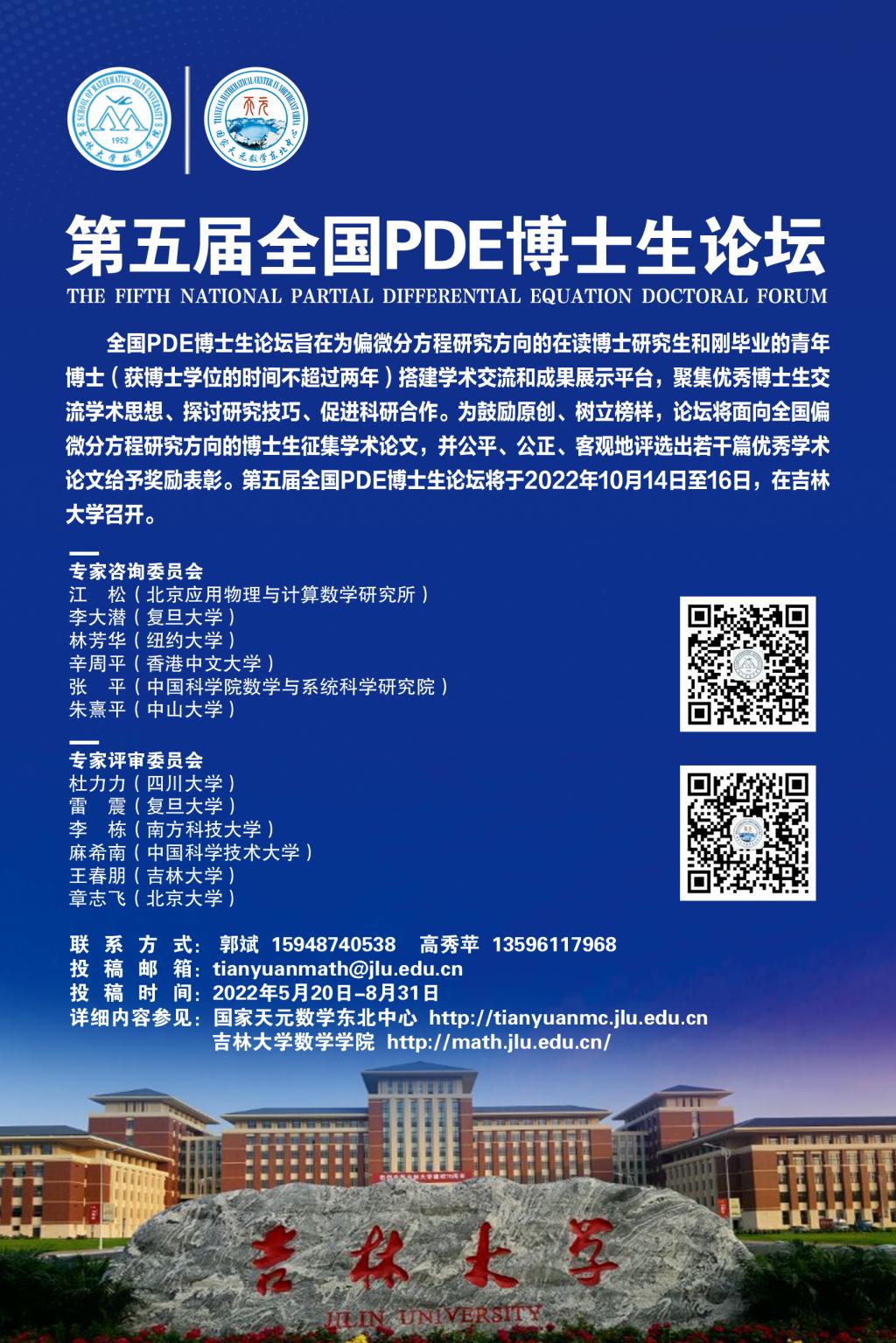 全国PDE博士生论坛已成功举办四届:复旦大学(第一届,2018年11月)、北京大学(第二届,2019年10月)、中国科学技术大学(第三届,2020年11月)、厦门大学(第四届,2022年4月),吉林大学将于2022年10月14日至16日举办“第五届全国PDE博士生论坛”,我们诚挚地邀请全国偏微分方程方向的博士生及青年博士参加本次论坛。