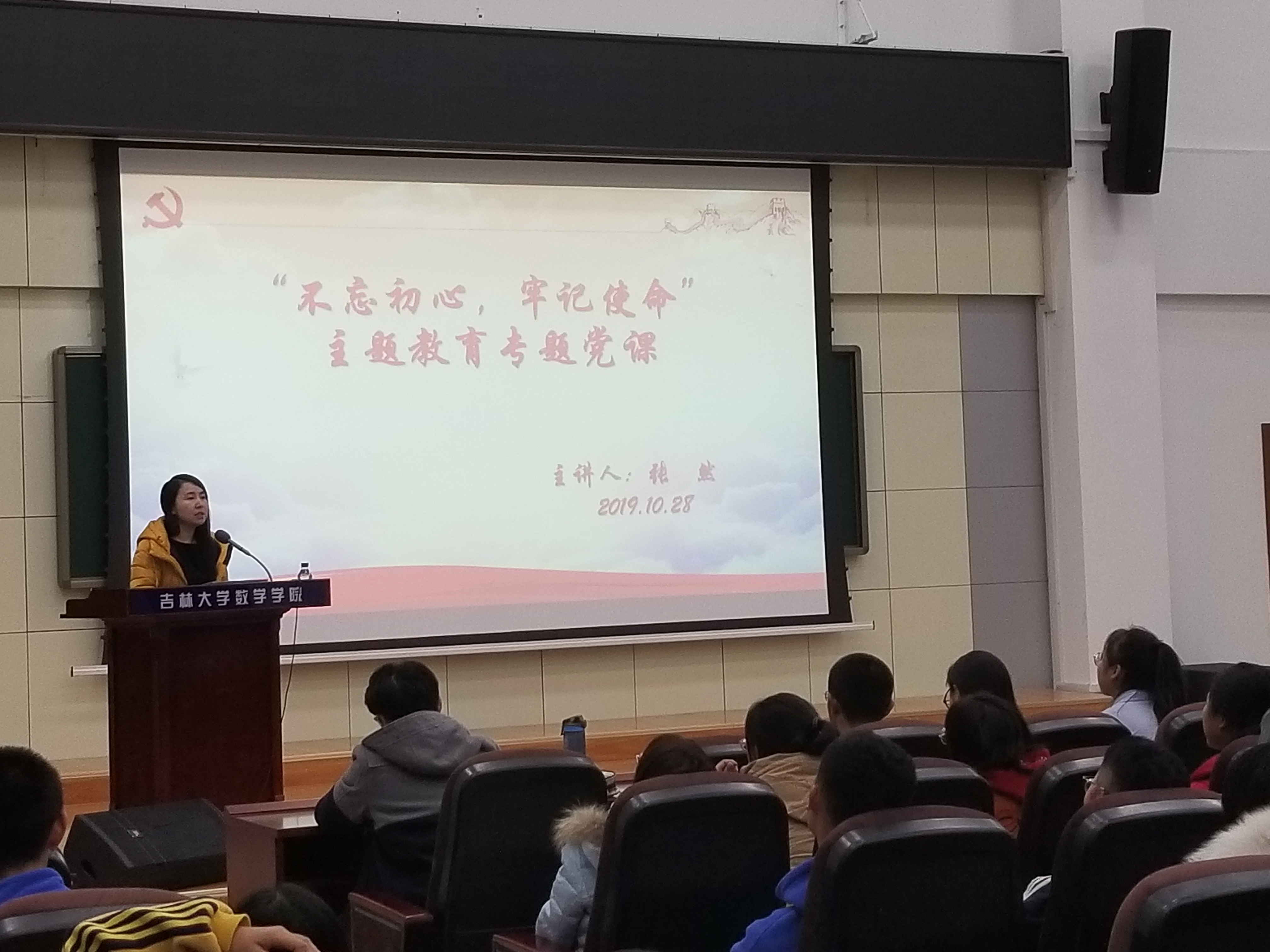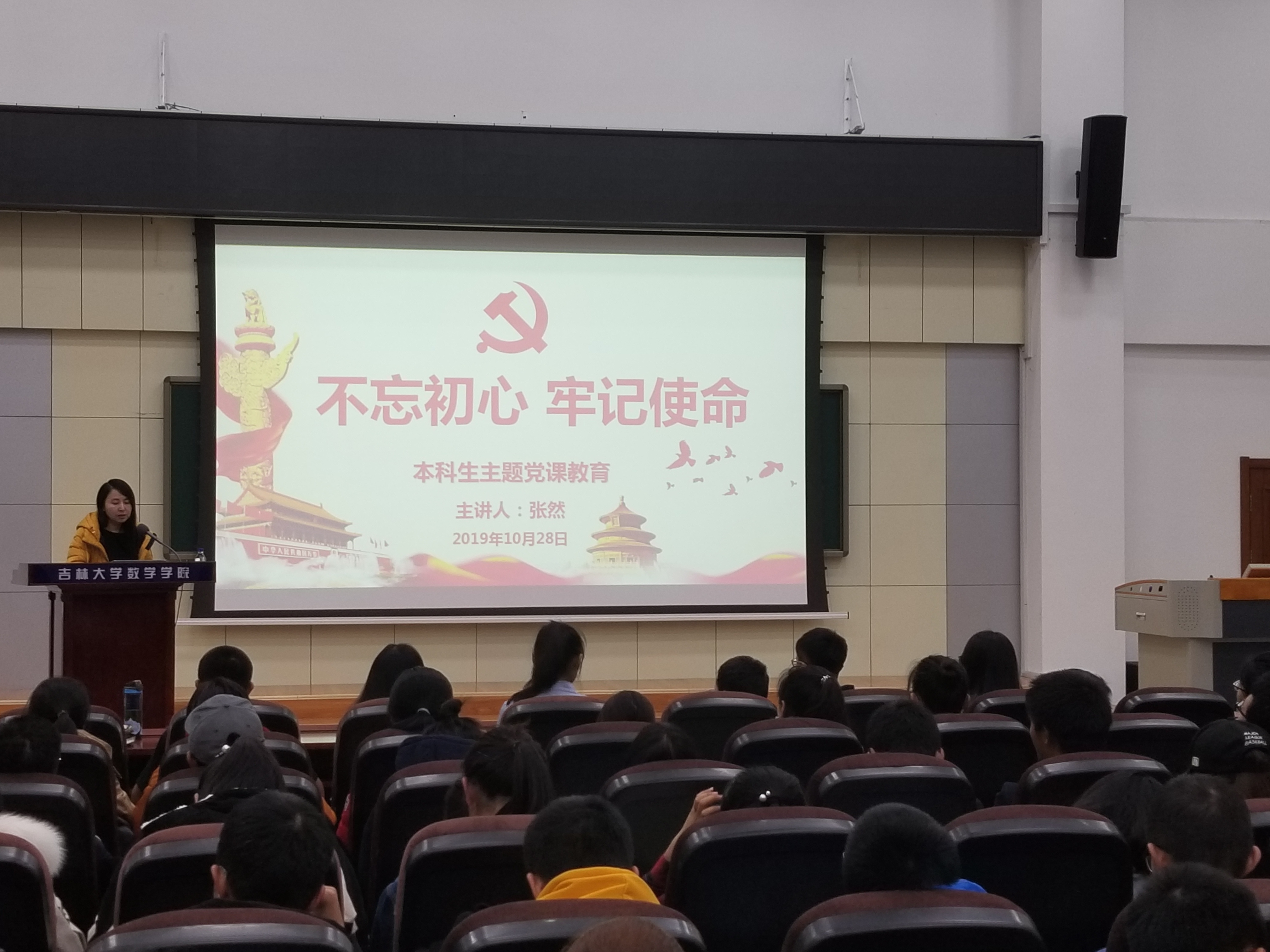 为贯彻落实中共中央的工作部署和《吉林大学开展“不忘初心、牢记使命”主题教育实施方案》的具体工作要求,beat365中国官方网站于20191028日下午七点,在数学楼报告厅进行了面对19级全体同学的党课。本次党课由数学学院党委书记张然教授主讲。