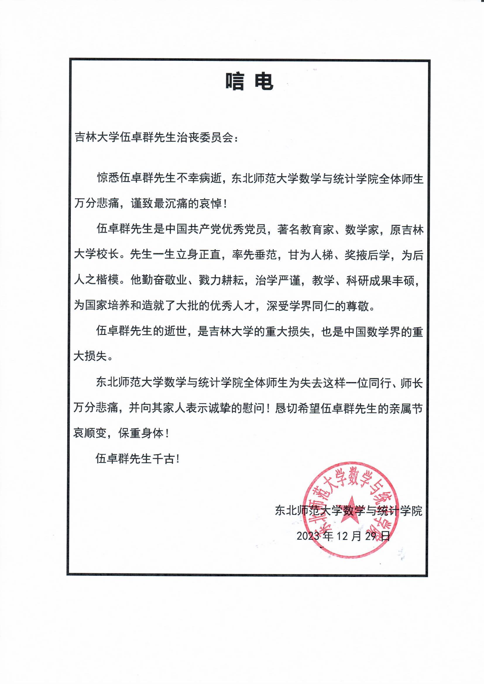 东北师范大学数学与统计学院唁电