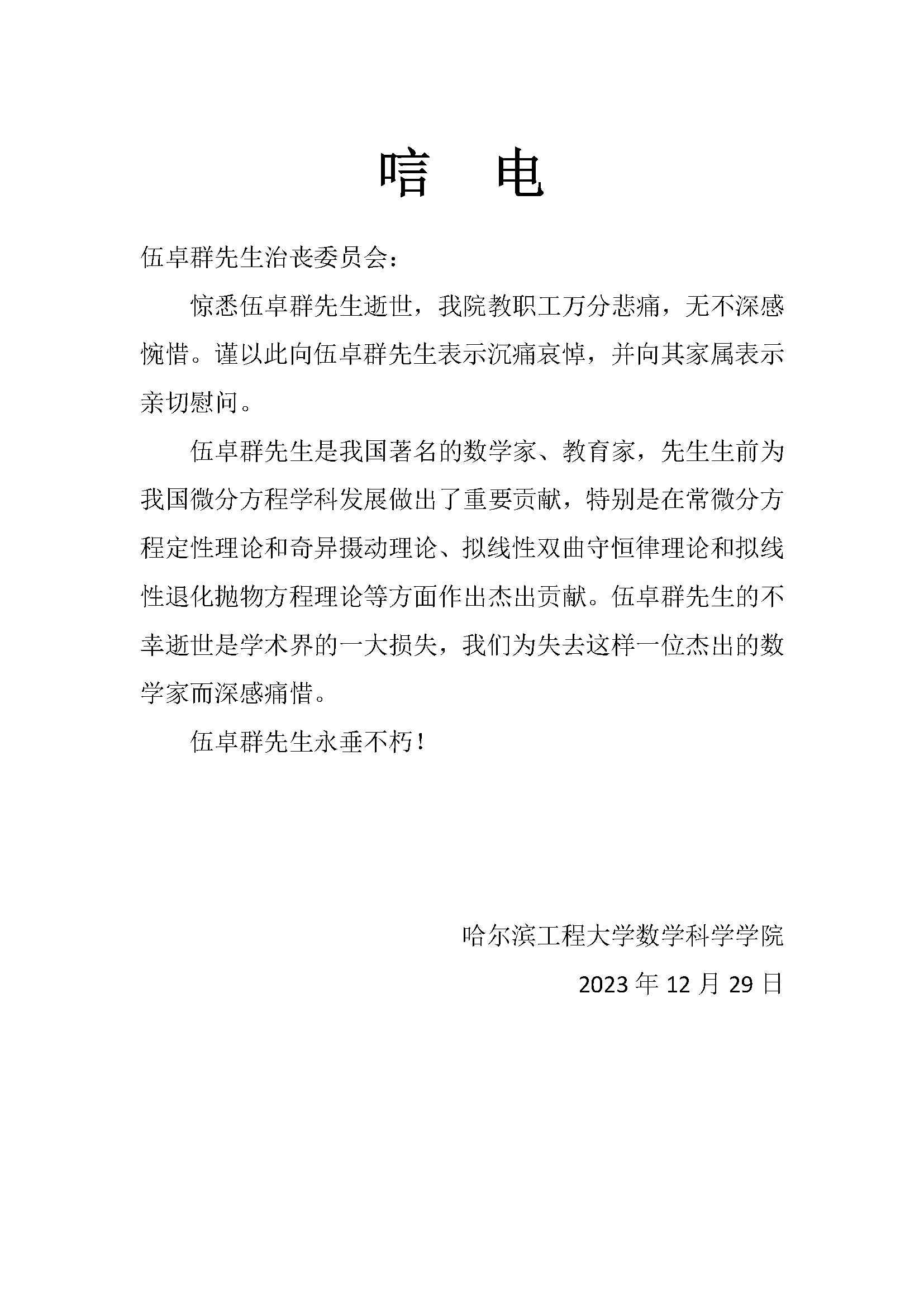 哈尔滨工程大学数学科学学院唁电