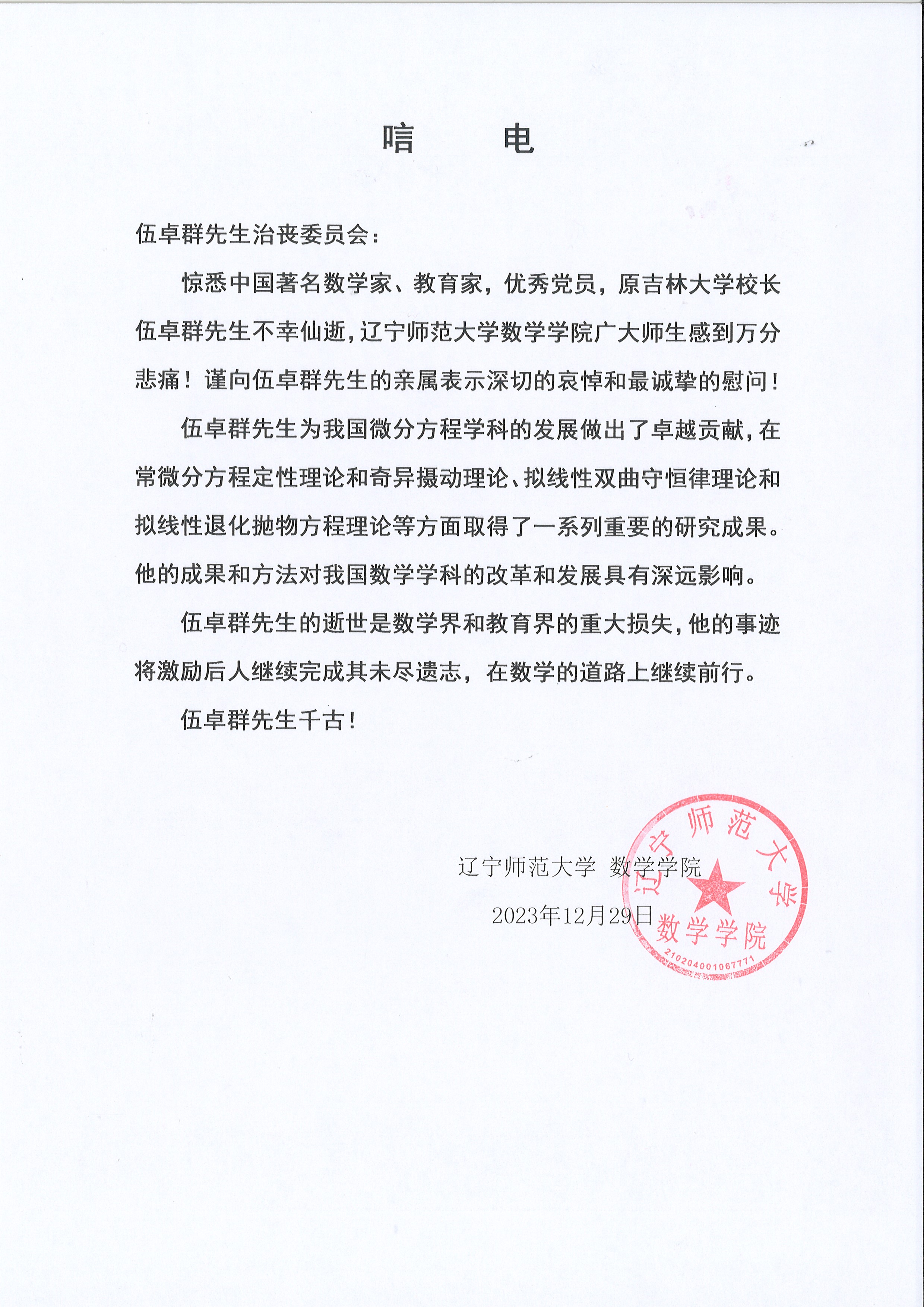 辽宁师范大学数学学院唁电