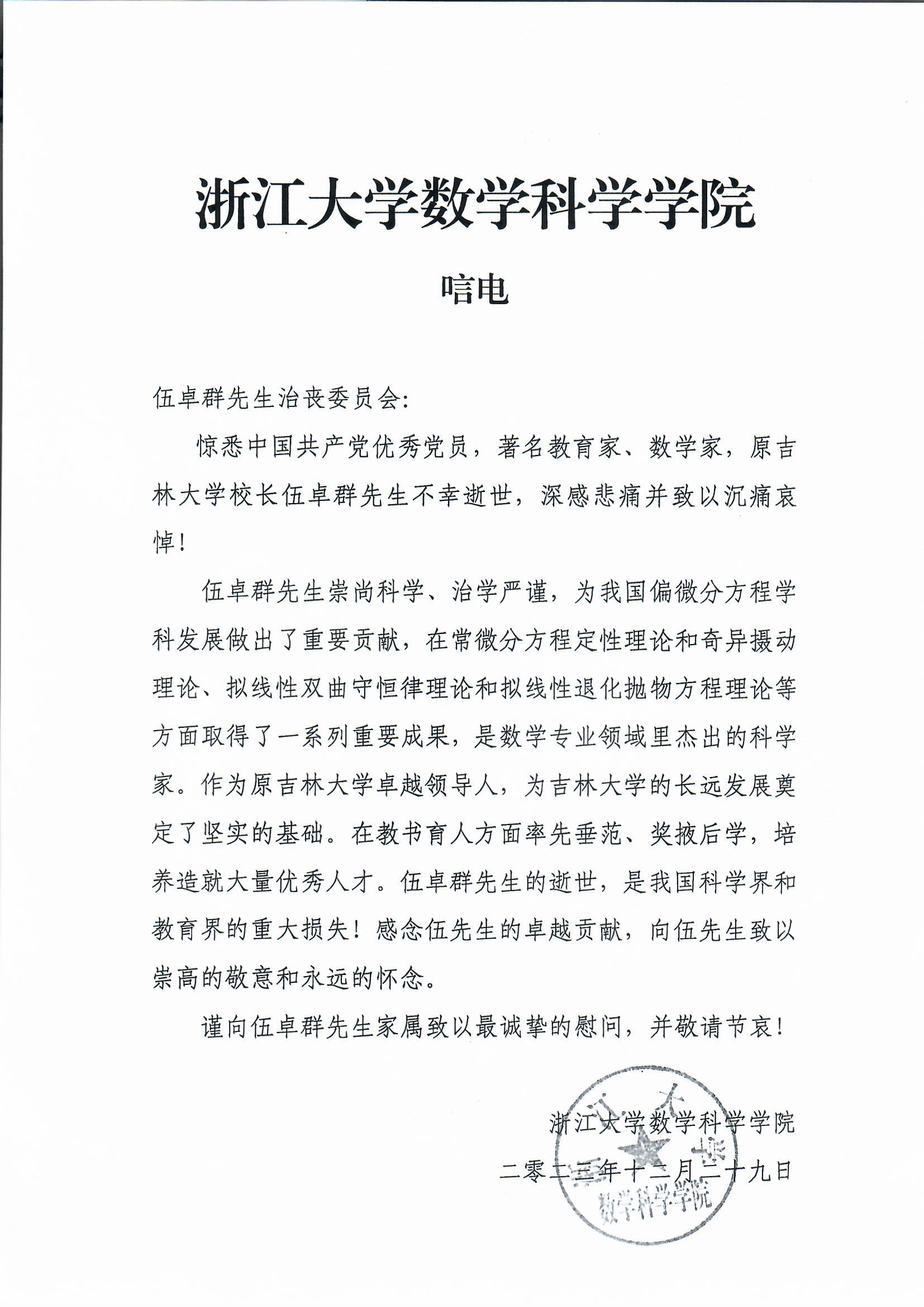 浙江大学数学科学学院唁电